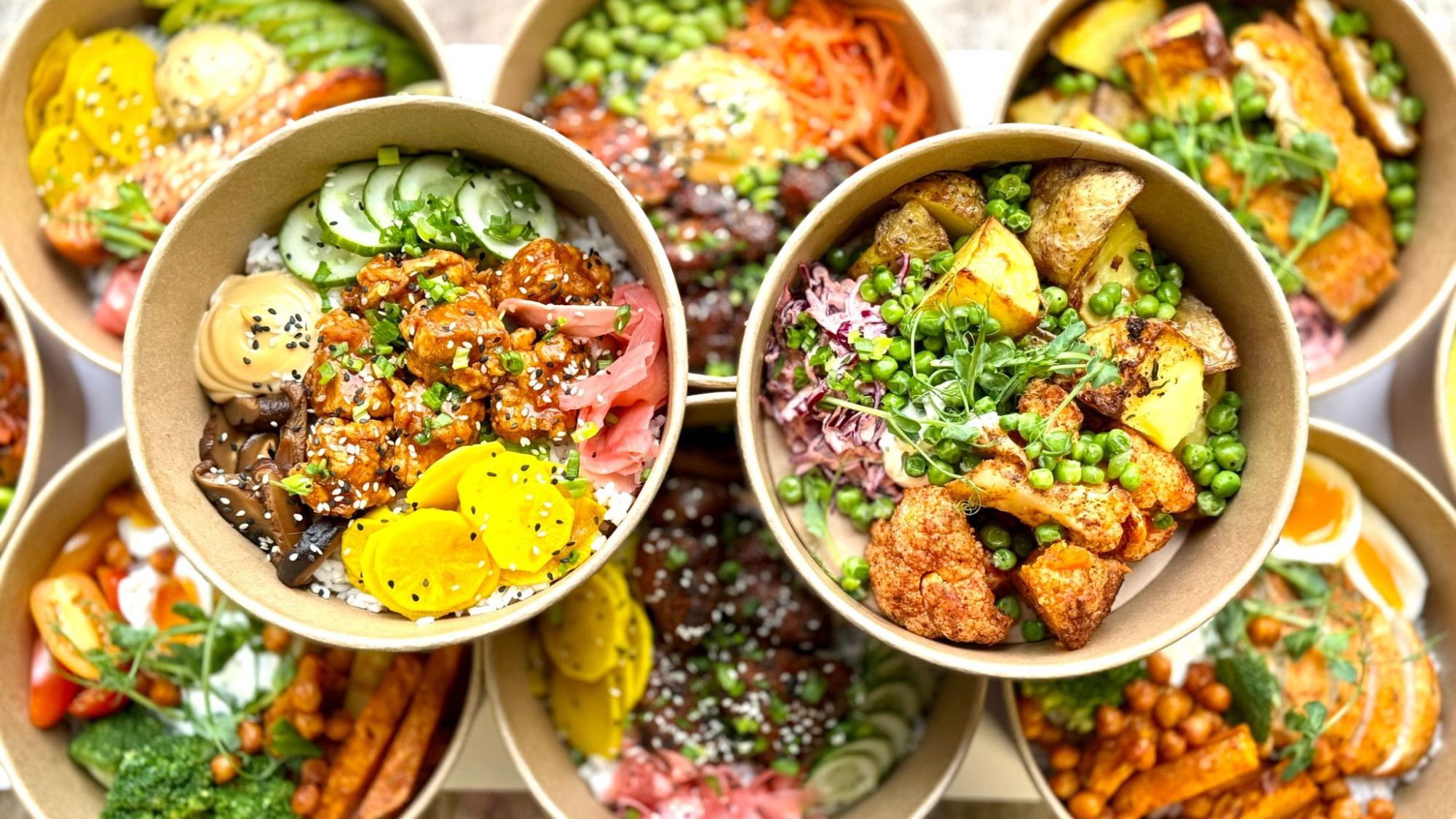 teriyaki chicken, rice noodles, carrot pickles, edamame, pak choi, mango chutney, pickled ginger, shiitake, sesame seeds, unagi mayo -